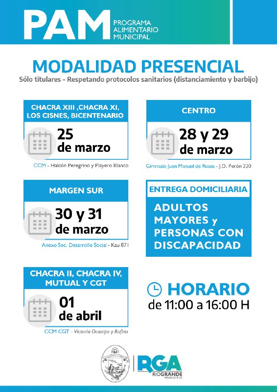 El Municipio de Río Grande informa a los y las beneficiarias del ‘Programa Alimentario Municipal’ que, a partir de este viernes 25 de marzo, iniciará la entrega de los respectivos módulos a las familias en los distintos puntos de la ciudad.
