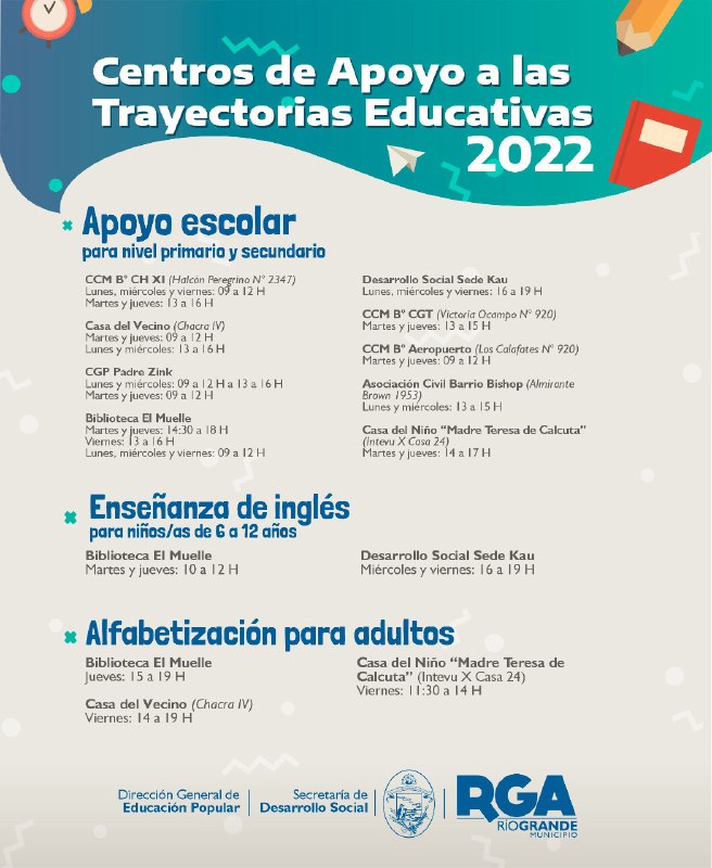 Por otra parte, quienes estén interesados en las “Clases de Inglés” para niños y niñas, las encontrarán en la biblioteca “El Muelle” y la sede de Desarrollo Social de Kau; y aquellos adultos que deseen ser parte del programa de alfabetización, podrán realizarlo en la Casa del Vecino de Chacra IV; en la biblioteca “El Muelle”, como así también en la Casa del Niño “Madre Teresa de Calcuta”.
