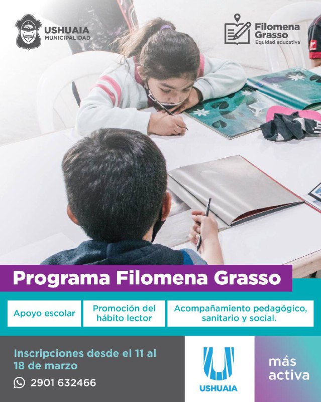 Ushuaia 15/03/2022.- La Secretaría de Cultura y Educación de la Municipalidad de Ushuaia continúa inscribiendo hasta el próximo 18 de marzo, a niños y niñas de entre 6 y 12 años que se encuentran cursando la escuela primaria en la ciudad, para participar del ciclo lectivo 2022 del Programa ‘Filomena Grasso’.