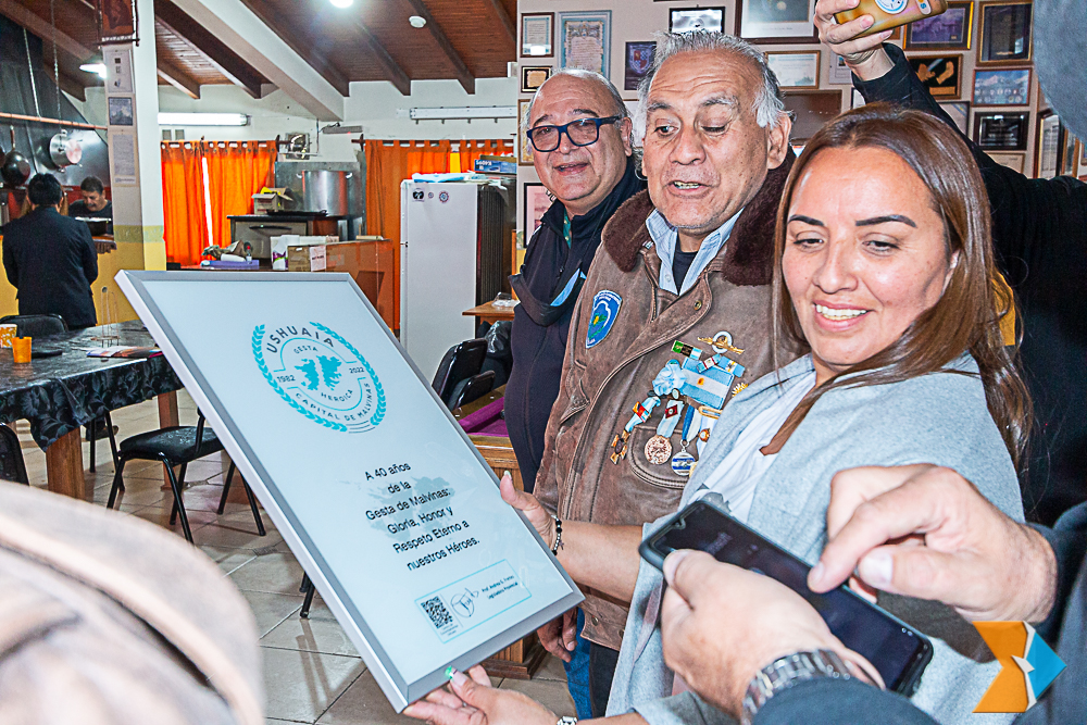 La placa “tiene un código QR que lleva a la página de Internet del Centro de Excombatientes de Malvinas en Ushuaia”, detalló y agregó que similar acto compartirá con el Centro de Río Grande.
