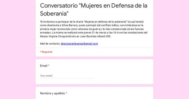 En este sentido, en las instalaciones del Museo Municipal «Virginia Choquintel» (Alberdi 555), este jueves 31 de marzo se llevará a cabo el conversatorio «Mujeres en Defensa de la Soberanía», a cargo de la disertante Silvia Barrera. La actividad es organizada por la Secretaría de la Mujer, Género y Diversidad; y será a partir de las 16 horas. Quienes quieran participar, pueden inscribirse en https://forms.gle/DgYKXhdX8NXGuCEcA