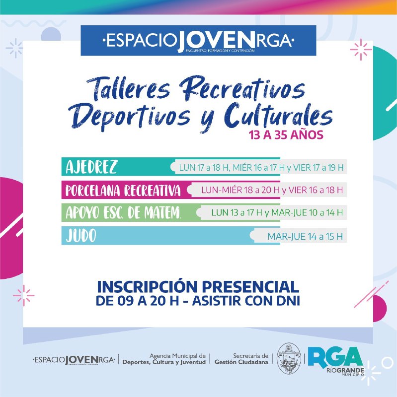 Rio Grande 18/04/2022.- Estos son Ajedrez, Judo, apoyo escolar de matemática y porcelana recreativa. Están destinados a jóvenes entre los 13 y los 35 años de edad. Acercate a O’ Higgins 791, de 9 a 20 horas, y se parte de estas nuevas propuestas. Participá de un espacio de encuentro junto a quienes disfrutan lo mismo que vos.