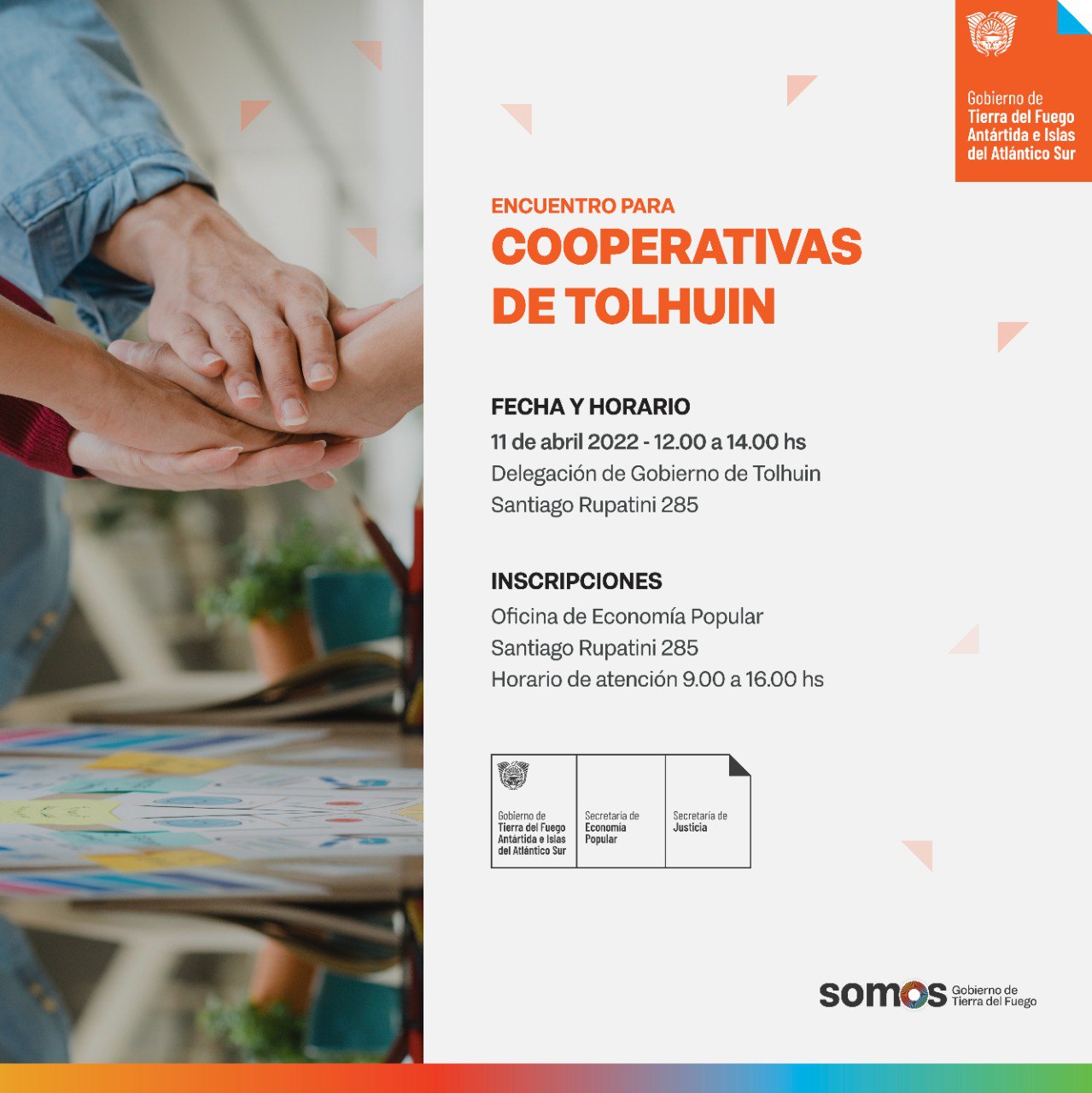 Tolhuín 08/04/2022.- El Gobierno de Tierra del Fuego AeIAS, a través de la Secretaría de Economía Popular perteneciente al Ministerio de Desarrollo Humano en conjunto con la Secretaría de Justicia, convoca a las cooperativas de trabajo de dicha localidad a una charla informativa el día 11 de abril en la Delegación de Gobierno de Tolhuin (Santiago Rupatini 285) en el horario de 12 a 14 hs.