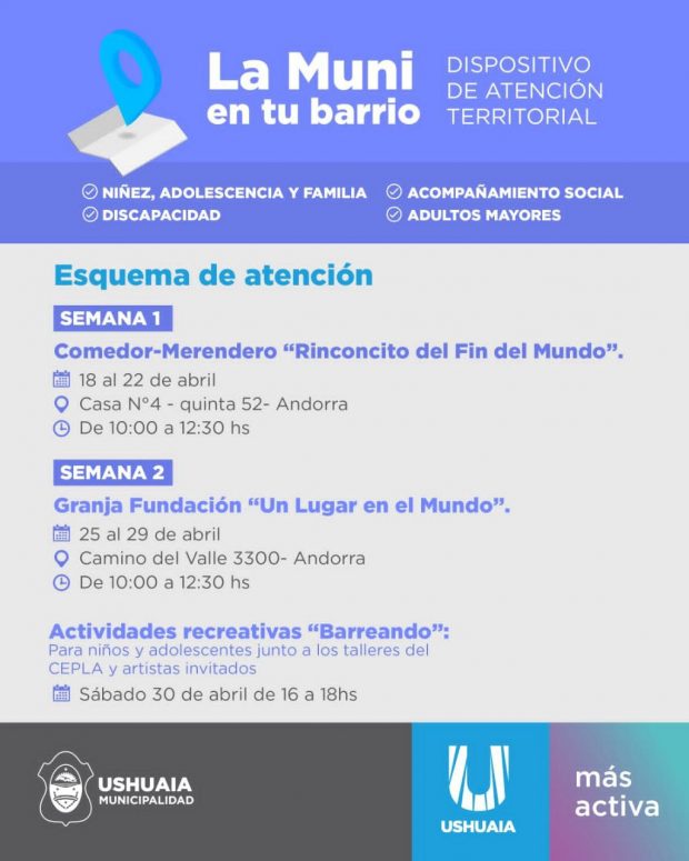 El dispositivo “La Muni en tu Barrio” atenderá en los distintos puntos de Andorra de 10:00 y 12:30 hasta el 29 y realizará el cierre de actividades el 30 de abril, de 16 a 18 horas, con una merienda, música, artistas del CePLA-El Palomar, juegos de kermes y artistas invitados”.