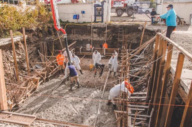 El ing. Christian Videla, subsecretario de Servicios Públicos, contó que “hoy se vertieron 30 m3 de hormigón H30 para la base y muros perimetrales de la cámara principal”.