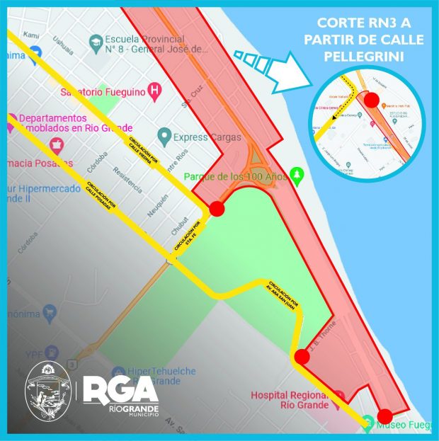 Asimismo, a las 23:30 horas se cortará la Avenida Belgrano. La extensión entre Ruta 3 hacía la Rotonda de Avión permanecerá cerrada y, en caso de haber mucha circulación de peatones, se cortará también, Córdoba y Ruta 3.