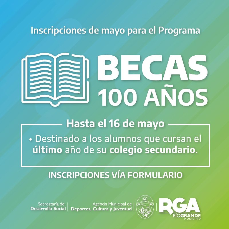 En ese sentido, a través de la Secretaría de Desarrollo Social y de la Agencia Municipal de Deportes, Cultura y Juventud, el Municipio anuncia que están abiertas nuevamente las inscripciones para acceder a las “Becas 100 Años”, las cuales están destinadas a acompañar a aquellos alumnos y alumnas que se encuentren cursando el último año de colegio secundario.