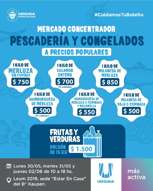 Se ofrece el kilo de merluza sin espinas a $750, el kilo de calamar entero a $700 (10 unidades), hamburguesas de merluza a $500 el kilo (10 unidades), milanesas de merluza a $850 el kilo, hamburguesas de merluza con espinaca y queso a $550 el kilo y milanesas de soja con espinaca a $500 por kilo. Además, habrá bolsones de 15 kilos de frutas y verduras a $1500.