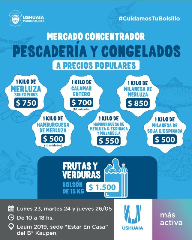 Ushuaia 22/05/2022.- Este lunes 23, martes 24 y jueves 26 de mayo el Mercado Concentrador de pescados y congelados de la Municipalidad de Ushuaia funcionará en el barrio Kaupén, en la sede de “Estar en Casa” ubicada en Leum 2019.