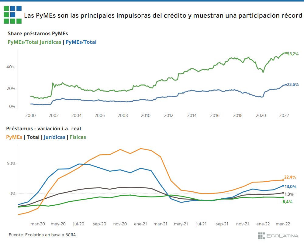 En relación con los préstamos a empresas, es crucial la distinción entre grandes empresas y PyMEs, ya que en el caso de las primeras sí se estaría viendo un impacto de la suba de tasas, pero las segundas son el motor del crédito reciente: a fines del primer trimestre el crédito PyME crecía un 22,4% i.a. real, mientras que las grandes empresas acumulaban 11 de 12 meses con caídas interanuales.