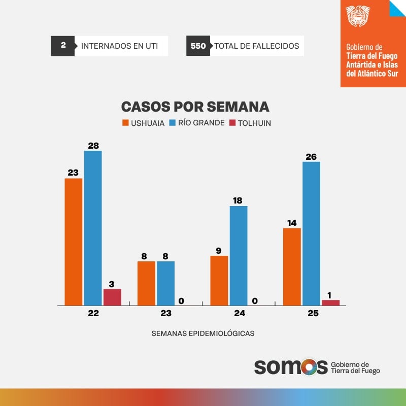 Los nuevos casos positivos así como los casos graves de Covid-19 (internados y fallecidos) siguen informándose en su totalidad en todos los establecimientos. En este marco, el Ministerio de Salud de Tierra del Fuego AIAS actualizó el informe de situación en cuanto a la pandemia de Covid-19 en la provincia y su evolución correspondiente a la vigesimoquinta semana epidemiológica de 2022. Se reitera la importancia de mantener las medidas de higiene y cuidados para evitar contagios. Esto incluye especialmente completar el esquema de vacunación y ventilar los ambientes.