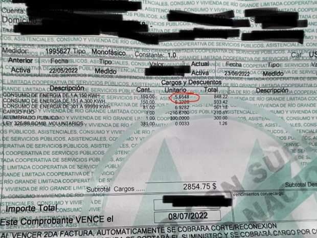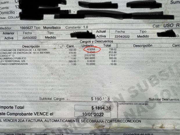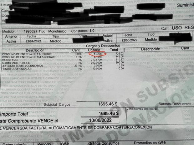 Los usuarios de la cooperativa eléctrica de Rio Grande que ven con sorpresa que marzo no tenían subsidio y pagaban 4,92 el kw y como en marzo y con subsidio siguen pagando 4,92 el kw.