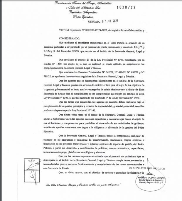 El decreto lleva la firma del mandatario provincial, el Ministro de Economía y Finanzas y de Agustín Tita, Ministro Jefe de gabinete bajo el numero 1630/2022.