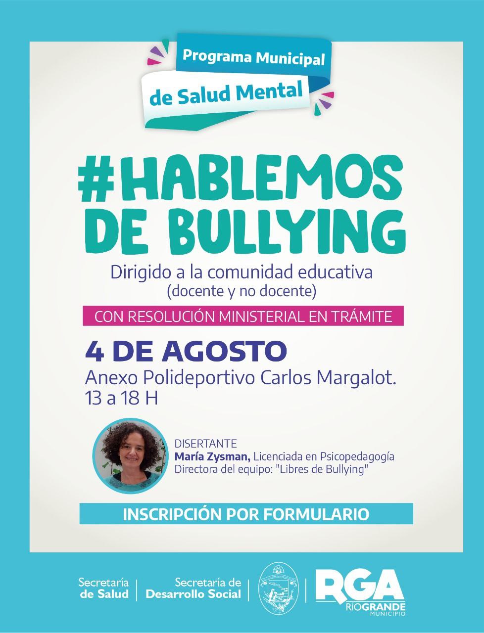 En el marco del Programa Municipal de Salud Mental, el Municipio de Río Grande invita a la comunidad educativa (docente y no docente) a participar de la charla “Hablemos de Bullying”. La misma estará a cargo de la Lic. en Psicopedagogía y directora del equipo de diagnóstico, prevención e intervención «Libres de Bullying», María Zysman.