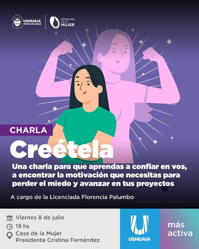 Ushuaia 07/07/2022.- La Municipalidad de Ushuaia, por intermedio de la Secretaria de la Mujer, invita a participar de la charla “Créetela”, a cargo de la Licenciada Florencia Palumbo, el viernes 8 de julio a las 19 horas en la Casa de la Mujer “Presidenta Cristina Fernández”.