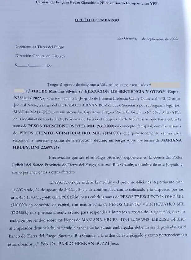 Entre capital e intereses, la dirección de haberes deberá retener $ 534.000 de los salarios de Mariana Hruby, y depositarlos en la cuenta del juzgado en el Banco de Tierra del Fuego.