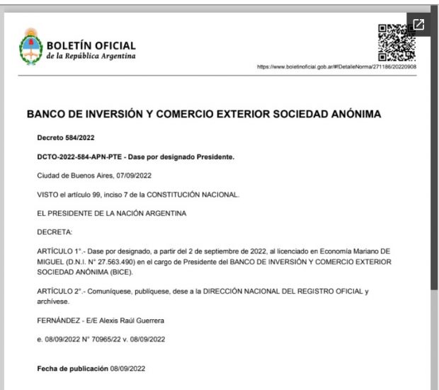 Buenos Aires 09/08/2022.-E l Gobierno Nacional designó al economista Mariano de Miguel como presidente del Banco de Inversión y Comercio Exterior (BICE), en reemplazo de José de Mendiguren. El nombramiento se formalizó por medio del decreto 584/2022 publicado en el Boletín Oficial. El funcionario se desempeño hasta su designación como presidente del Banco de Tierra del Fuego.