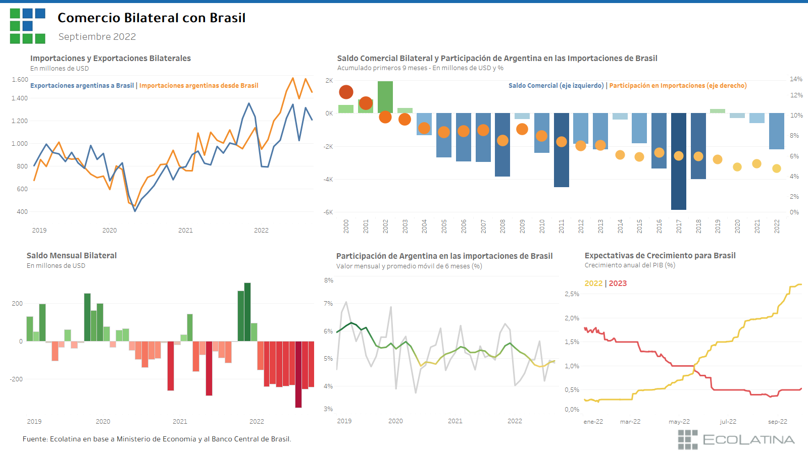 Con esta dinámica, las exportaciones acumuladas hasta septiembre superaron ya los USD 9.700 millones (+19% i.a.), aunque fueron ampliamente superadas por unas importaciones que rozando los USD 11.900 millones (+36% i.a.). En consecuencia, el saldo comercial bilateral acumulado en lo que va de 2022 muestra un rojo de USD 2.184 millones, el más elevado en los últimos cuatro años y más de tres veces el evidenciado para el mismo periodo en 2021 (USD 600 millones).