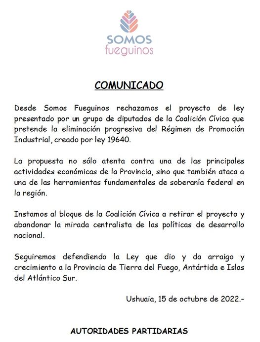 Desde Somos Fueguinos rechazamos el proyecto de ley presentado por un grupo de diputados de la Coalición Cívica que pretende la eliminación progresiva del Régimen de Promoción Industrial, creado por ley 19640.