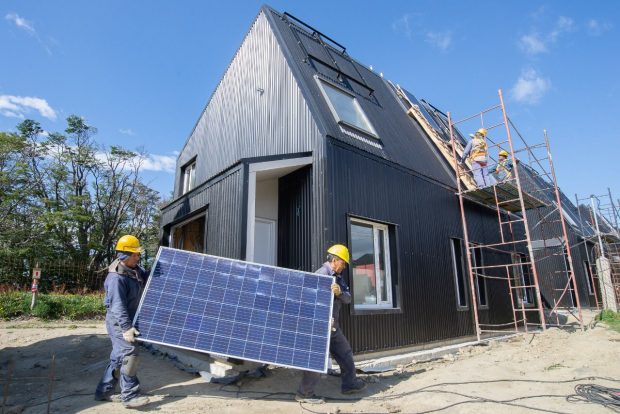 El avance de la obra se encuentra en etapa de revestimiento interior en durlock y colocación de paneles generadores fotovoltáicos, encargados de la provisión de energía en estas particulares viviendas. La obra también contempla la colocación de un sistema solar térmico para agua caliente o calefacción.