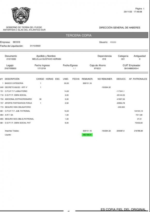 Arriba el recibo de sueldo del Gobernador de la Provincia, Gustavo Melella.