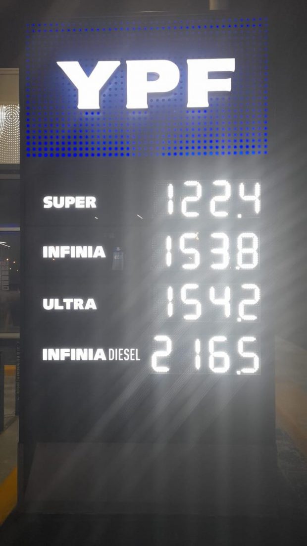 Rio Grande 04/12/2022.- YPF aumentó los precios de los combustibles en nuestra ciudad y los valores a partir de hoy, son los siguientes Super 122.4pesos, Infinia 153,8 pesos, Ultra 154,2 pesos, Infinia Diesel 216,5 pesos. Este es el sexcto aumento en lo que va del año autorizado por el gobierno nacional.
