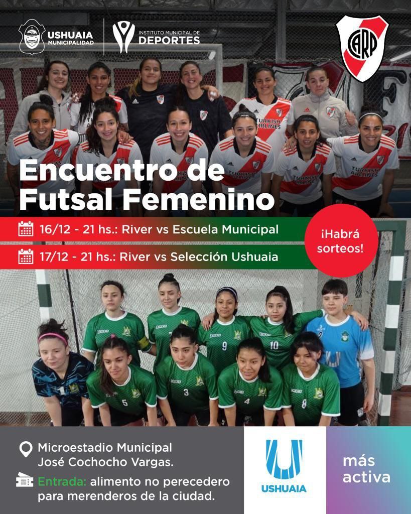 Ushuaia 14/12/2022.- En el marco del cierre anual de actividades, de la Escuela Municipal de Futsal femenino y del Club River Plate, el próximo viernes 16 y sábado 17 de diciembre se pondrá en marcha el Encuentro de Futsal femenino, organizado por el Instituto Municipal de Deportes.