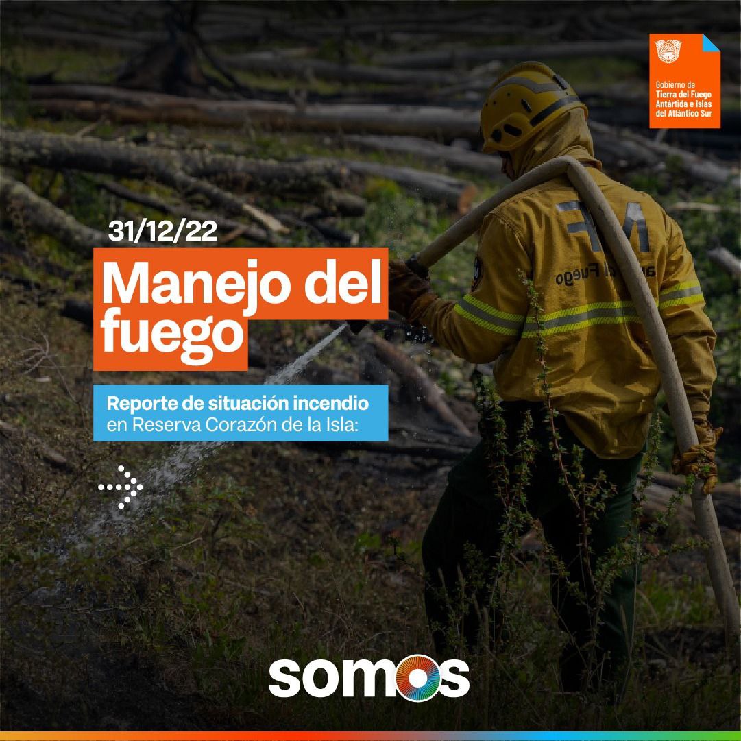 Continúan trabajando los equipos de la Dirección Provincial de Manejo del Fuego;; Bomberos Voluntarios; Guardaparques provinciales; Defensa Civil; Policía Provincial y Armada Argentina.