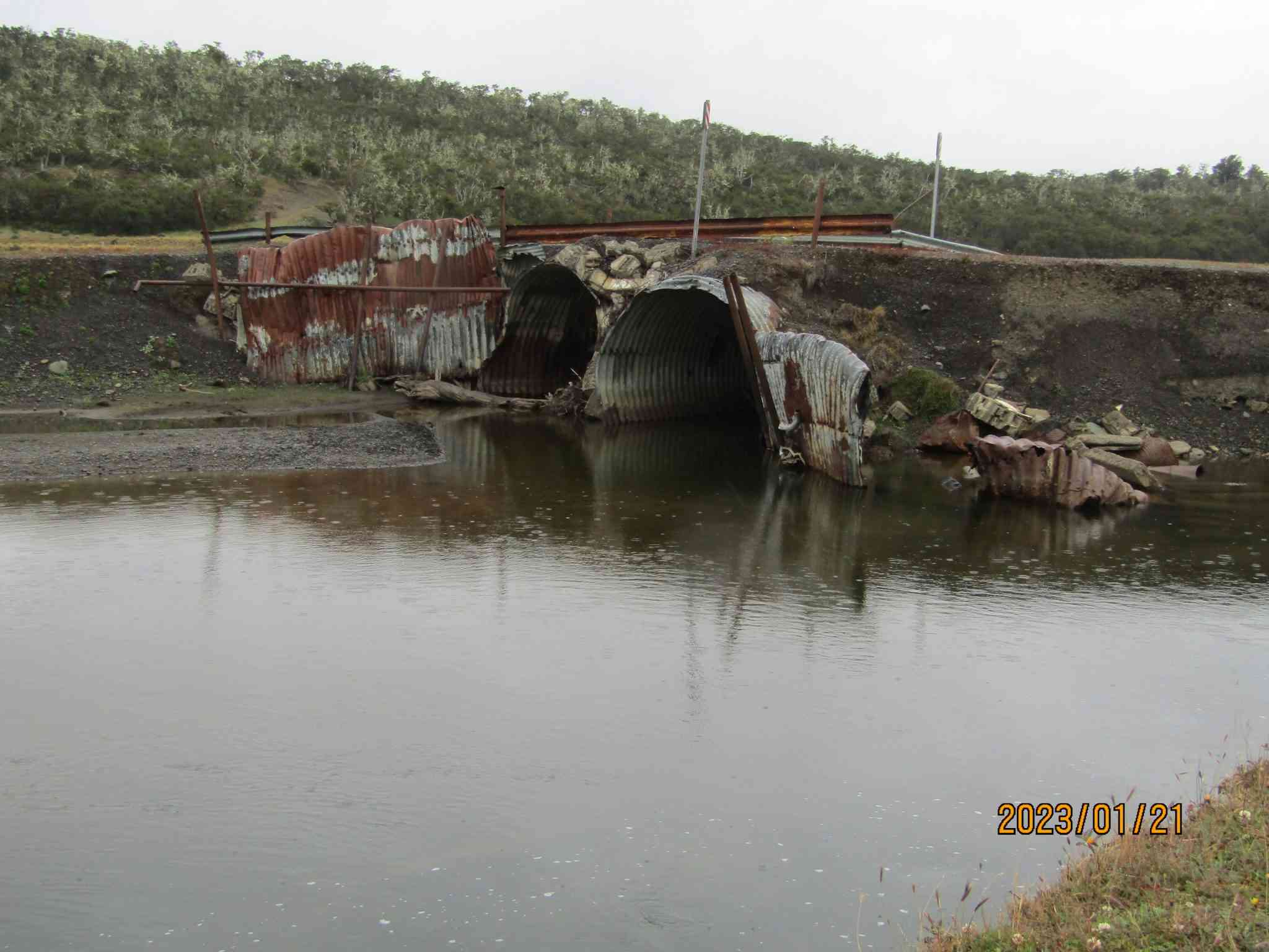 La obra que se realizó durante el Gobierno de Rosana Bertone fue arrastrada por el agua dejando los dos caños centrales que se ven en la fotografía, pero el terraplén desapareció.