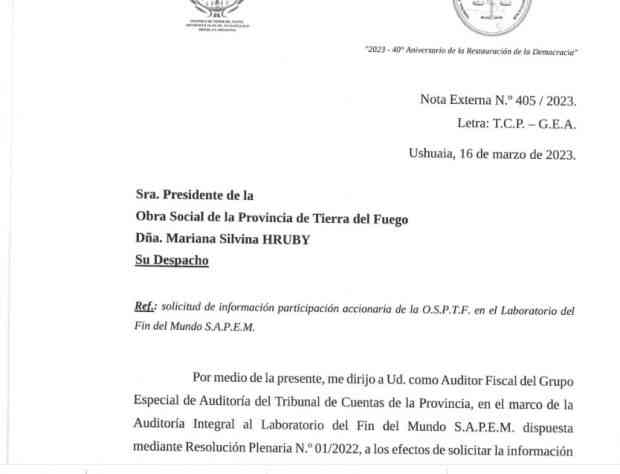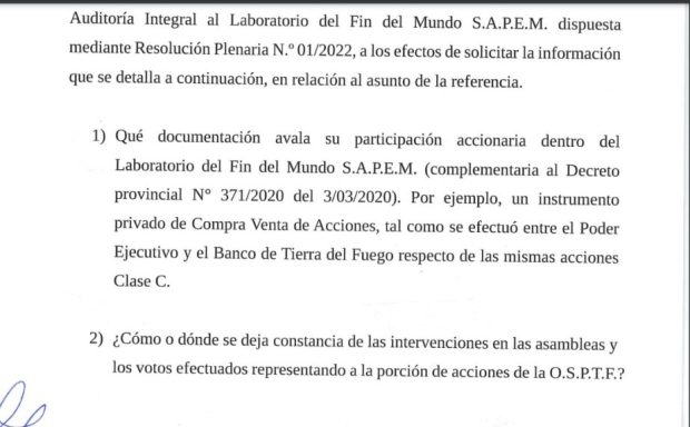 Abajo el TCO solicita información sobre la participación accionaria dentro del laboratorio del Fin del Mundo, como compra venta de acciones, tal como se efectuó entre el Poder Ejecutivo y el Banco de Tierra del Fuego.