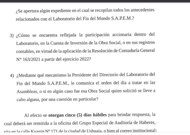 Una vez abierto el expediente lo que ven arriba son las preguntas que se le hicieron a la responsable de la obra social, como por ejemplo como se encuentra reflejada la participacion accionaria, en la cuenta de inversión de la obra social a partir de 2022 y mediante que mecanismo el presidente del Laboratorio del Fin del Mundo comunica el orden del día a tratar en las asambleas o si fue al obra social la que solicitó que se lleve a cabo alguna por una custion particular. Para responder esto el TCP le dio 5 días hábiles y enviarla a la oficina del Grupo Especial de Auditoria de Haberes.