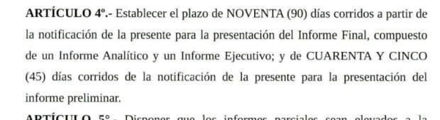 Como se puede ver arriba, es el propio Tribunal de Cuentas es el que impone un plazo de 90 días para la presentación del informe final, informe analítico y un informe ejecutivo y de 45 días corridos de la notificación de la presente para la presentación del informe preliminar. Todo esto se incumplió desde el inicio.