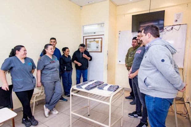 Ushuaia 25/04/2023.- Las autoridades de Ushuaia Integral Sociedad del Estado (UISE) entregaron indumentaria de trabajo al personal de la Unidad de Negocios Limpieza y Desinfección de la empresa, la cual fue confeccionada por emprendedoras locales.