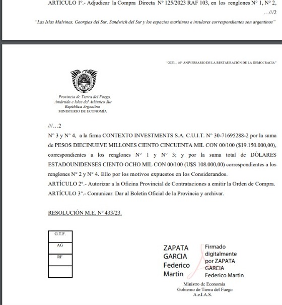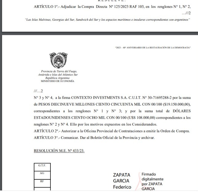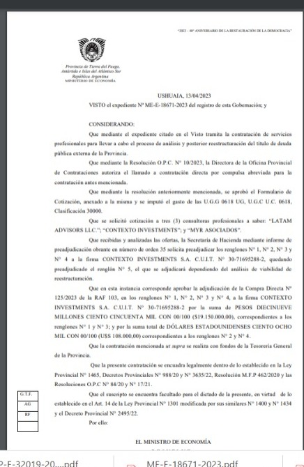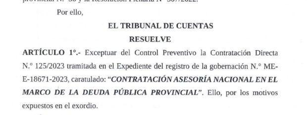 Rio Grande 30/05/2023.- El gobierno de la provincia contrato de manera directa a la empresa «contexto Investment S.A, por mas de 19 millones de pesos y lo mas llamativo el Tribunal de Cuentas decidió exceptuar el control sobre esta operación caratulada Contratación asesoría nacional en el marco de la Deuda Publica Provincial.