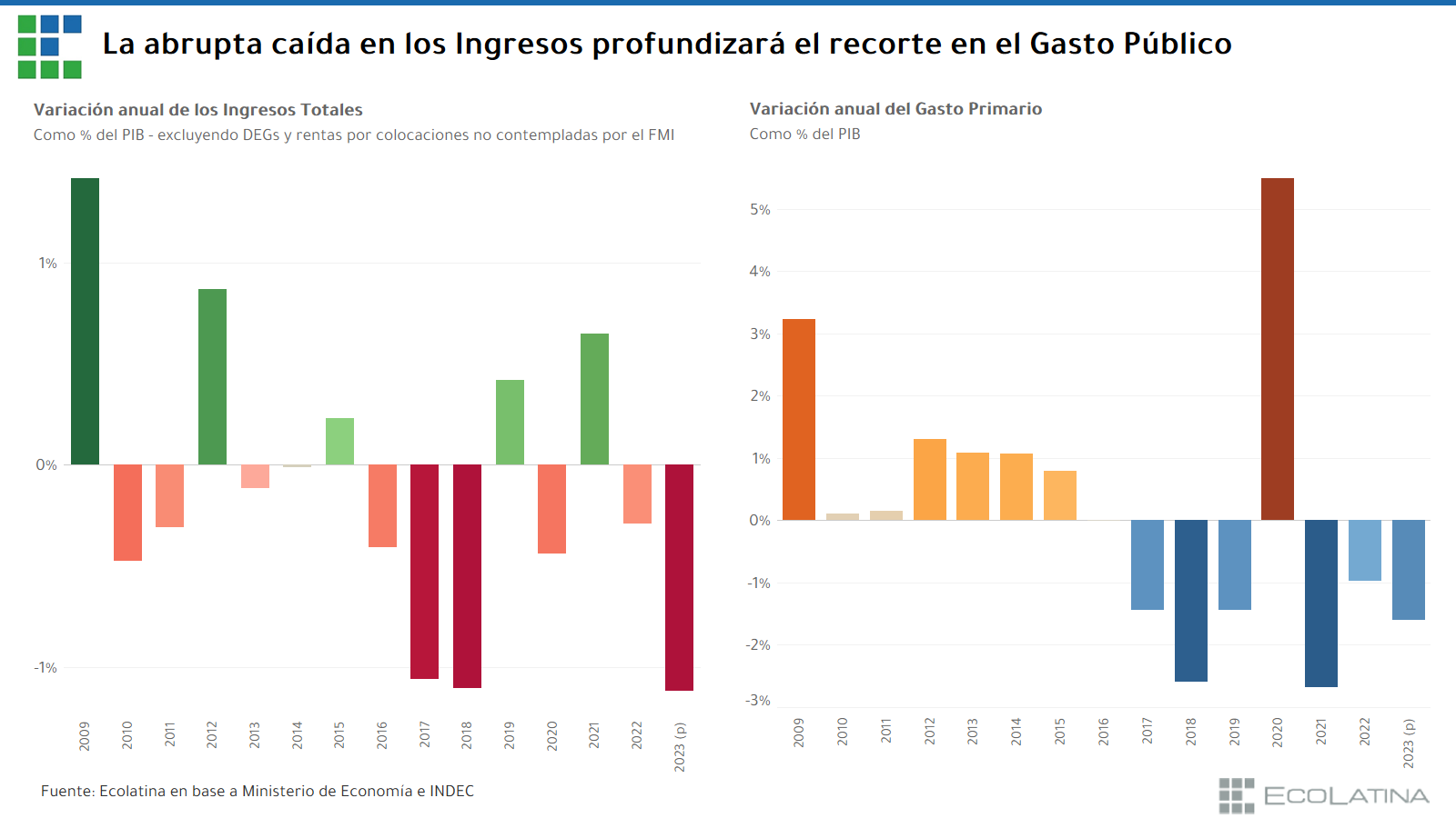 Si bien el ajuste sería mayor al evidenciado en 2022 (-1 p.p. del PIB), estaría en línea con la dinámica evidenciada entre 2017 y 2019. En este sentido, 2023 y 2019 serían los únicos años electorales en los que el Gasto Público se achica pese a enfrentarse a una recesión económica (en ambos casos, en el marco de un acuerdo con el FMI ante la falta de financiamiento). Sin embargo, a diferencia del 2019, el recorte del Gasto en 2023 no se materializaría en un 100% en una mejora de las cuentas públicas, dado que, como ya mencionamos, los ingresos mostrarían una caída abrupta, complejizando aún más el panorama.