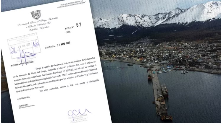 El gobernador Gustavo Melella ratificó mediante el decreto provincial 3312/22 la construcción de la base naval y dio giro a Mónica Urquiza, presidenta de la Legislatura de Tierra del Fuego, para que sea tratado por sus diputados. El acuerdo fue firmado con la empresa estatal china Shaanxi Chemical Industry Group Co. Ltd.