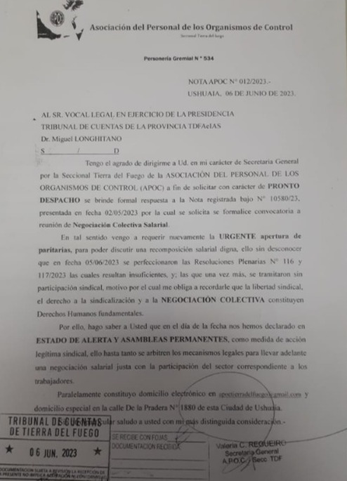 Ushuaia 06/06/2023.- Los trabajadores de los órganos de control (APOC) se declararon en estado de alerta y movilizacion en reclamo de una mejora salarial por considerar que el aumento otorgado el dia de ayer resulta insuficiente. La nota de reclamo fue dirigida a Miguel Longhitano presidente del Tribunal de Cuentas de la Provincia.