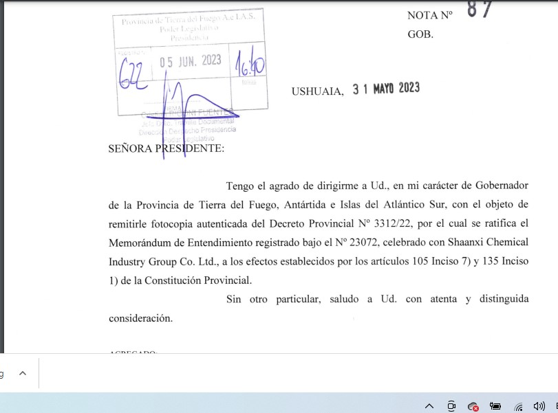 Rio Grande 07/06/2023.- Publicamos el texto completo del memorándum de entendimiento entre el Gobierno de la Provincia de Tierra del Fuego con la empresa china Shaanxi Chemical group confirmando inversiones del país asiático en un puerto y una planta de producción de urea, glifosato y amoniaco. El mismo no fue modificado en ninguno de sus párrafos.
