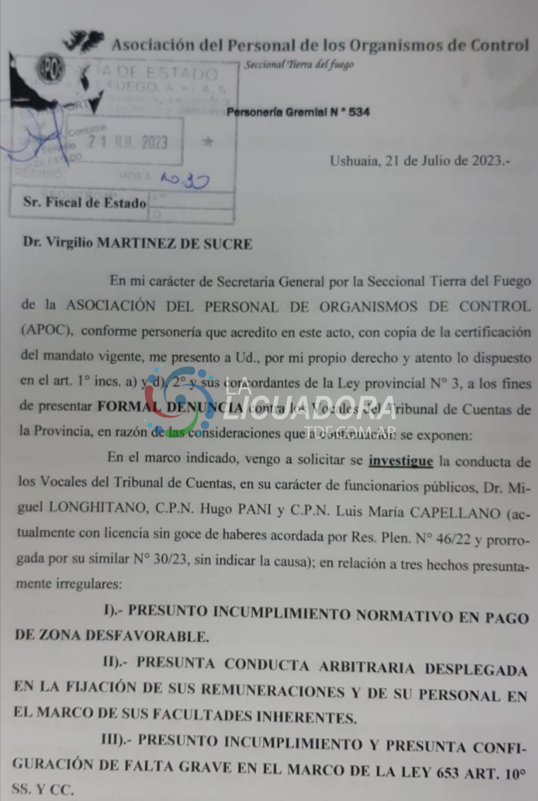 Rio Grande 21/07/2023.- La Asociación de Trabajadores de Organismos de Control, APOC, denuncia al Tribunal de Cuentas de la Provincia ante la Fiscalía de Estado por presunto incumplimiento normativo en pago de zona desfavorable,, Presunta conducta arbitraria desplegada en la fijación de las remuneraciones y de su personal en el marco de sus facultades inherentes, y por presunta configuración de falta grave en el marco de la Ley 653, art 10 y ss.cc.
