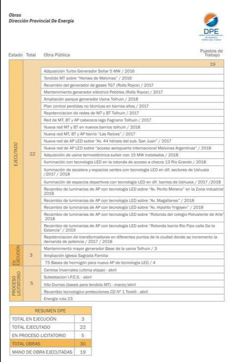 En este sentido, Bertone detalló algunas de las obras que se llevaron adelante para mejorar la provisión de energía en la provincia en su gestión. Durante el año 2016 se adquirió el Turbo Generador solliar, y el tendido MT sobre “Héroes de Malvinas”; en 2017 se realizó el recambio del generador eléctrico Pebbles (Rolls Royce) y tembién se realizaron trabajos de mantenimiento; así como la repotenciación de redes de MT y BT en Tolhuin, la red de MT, BT y AP cebacera lago Fagnano y en el barrio “Las Ráices”; nueva red MT y BT en nuevos barrios de Tolhuin; nueva red de AP LED sobre “Av. 44 héroes del Submarino San Juan” ; en el 2018 se llevó adelante la ampliación del parque generador Usina de Tolhuin que duplicó la generación de energía; se adquirió la usina termoeléctrica sulliar con 15 MW instalados. Durante los años 2017 y 2018 se realizó la repotenciación de transformadores en diferentes puntos de la ciudad de Ushuaia donde se incrementó la demanda de potencia; se amplió la capacidad del Centro de distribución del Río Pipo; se invirtió en el mantenimiento para el funcionamiento de la usina de Uhuaia; se adquirieron usinas Sullier para reforzar el parque energético.