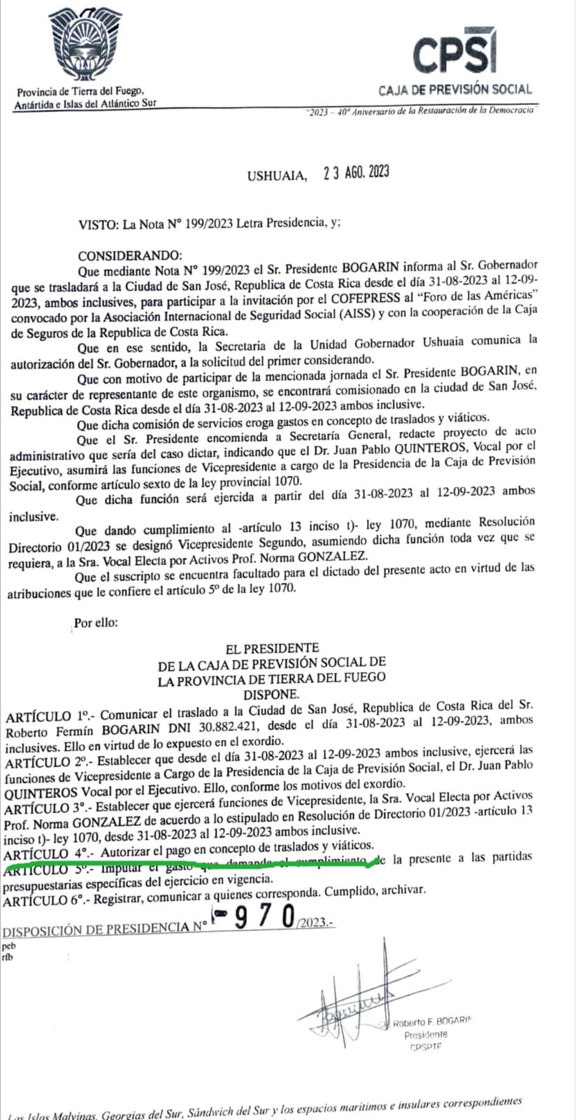 Arriba nota autorizando viáticos por transporte a Costa Rica al Presidente de la Caja de Previsión Roberto Fermín Bogarin, del 31 de agosto al 12 de septiembre para participar de la Reunión de COFEPRES.