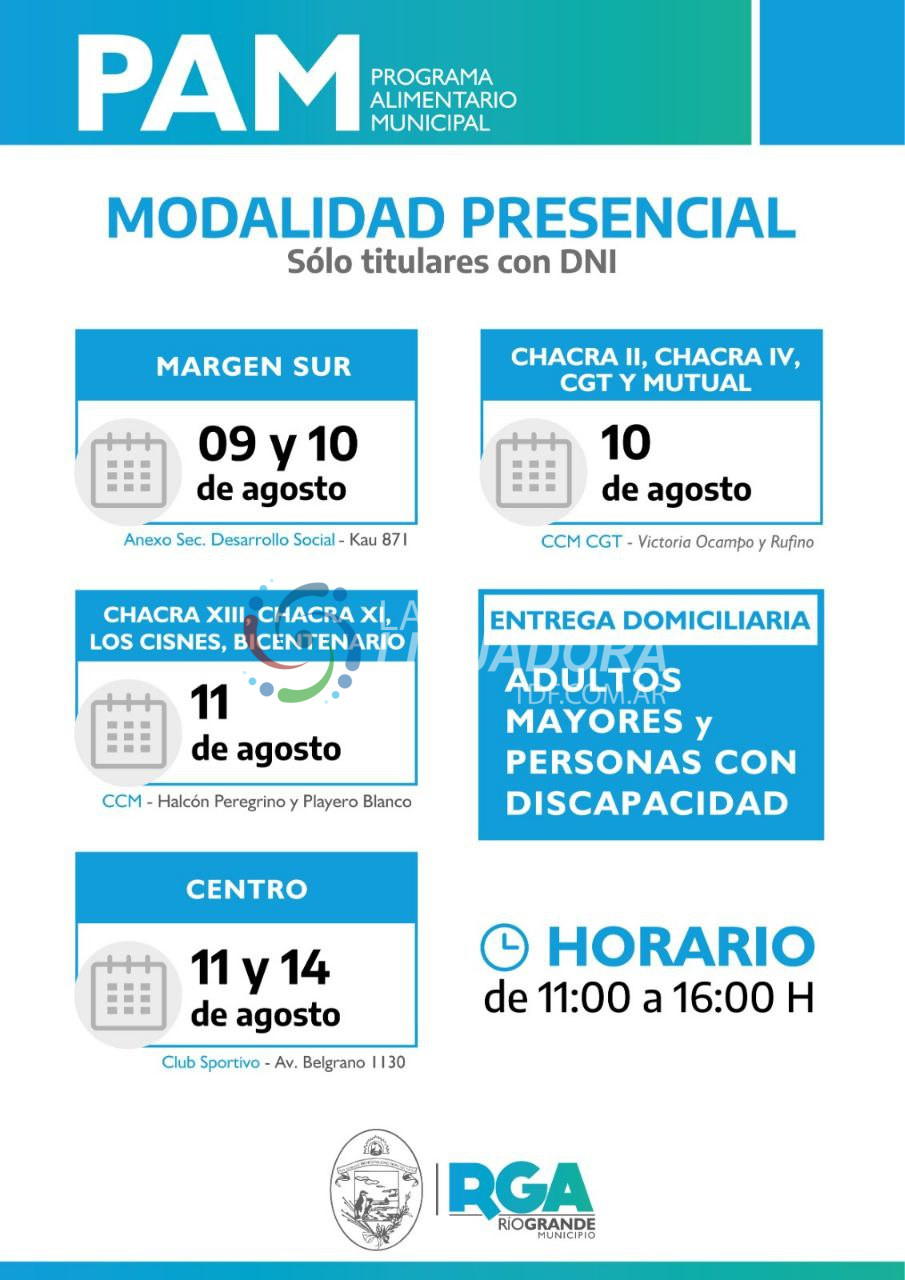 El miércoles 9 y jueves 10 de agosto la distribución en el anexo de la Secretaría de Desarrollo Social (Kau 871) será para los vecinos y vecinas de Margen Sur. El jueves 10 de agosto también será la entrega para los vecinos de los barrios Chacra II; Chacra IV; CGT y Mutual, en el CCM que está ubicado en Victoria Ocampo y Rufino.