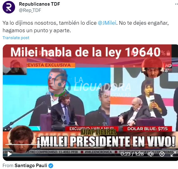 En un Twit de Santiago Pauli de Republicanos TDF, el pre candidato a presidente de Libertad Avanza, Javier Milei se refirió al regimen de promoción industrial y dijo que no quiere aumentar los impuestos en las Isla, sino bajarlos en el resto del país, a la vez que desmintió que en Tierra del Fuego se reciban subsidios, se pagan menos impuestos, aclaró.
