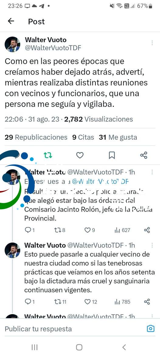 Ushuaia 01/09/2023.- El intendente de Ushuaia, Walter Vuoto denuncio en sus redes sociales que fue vigilado por un ex integrante de la policía provincial quien alegó encontrarse bajo las ordenes del Comisario Rolón jefe de la policía provincial . El jefe comunal dijo que esto le puede pasar a cualquier vecino.