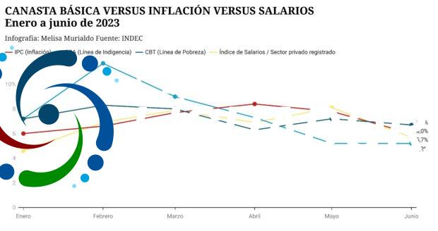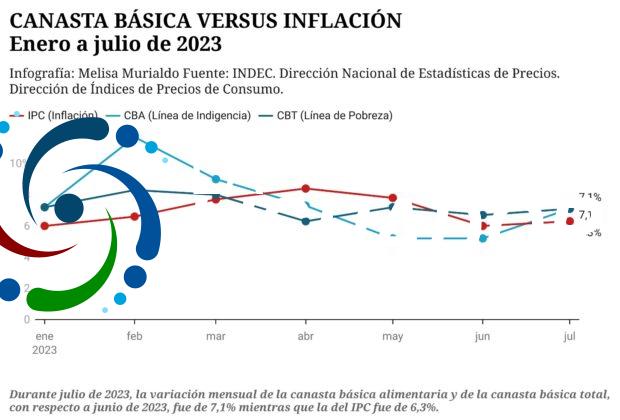 A pesar de que la CBA se ubicó por debajo de la inflación en junio, pues el alza fue de 5,2% y la del IPC fue de 6%; durante julio la historia volvió a cambiar: de acuerdo a la última medición del INDEC, la canasta básica alimentaria y la canasta básica total registraron un incremento del 7,1%, quedando por encima de la inflación que en ese mes fue de 6,3%.