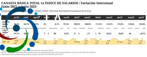 En tanto, el ajuste de 108,7% en los últimos 12 meses dejó a los salarios por debajo de la Canasta Básica Total, que tuvo un aumento del 123% entre junio de 2022 e igual mes de este año, en otras palabras, el costo de vida esencial aumentó 14.4 puntos porcentuales por encima de los sueldos. Incluso, esto se repitió en todas las ramas salariales, hasta la del sector público, que tuvo un ajuste anual del 121,4% y se ubicó 1,6 puntos por debajo de la CBT. La más perjudicada fue la del sector privado no registrado que para el mismo período interanual tuvo un ajuste en su índice salarial de sólo el 82,5%.