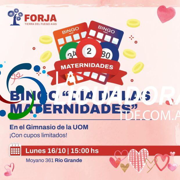 En el marco del Día de la Madre, desde el Espacio FORJA, se invita a todos los vecinos y vecinas a disfrutar del bingo “Día de las Maternidades” a celebrarse este lunes 16 de octubre a partir de las 15:00 horas en el Gimnasio de la UOM, ubicado en Moyano 361 de la ciudad de Río Grande.