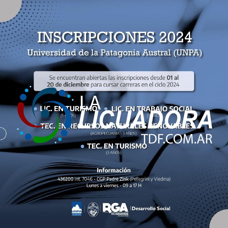 El Municipio informa a la comunidad que este viernes 1° de diciembre abren las inscripciones para el Ciclo Lectivo 2024 de la Universidad Nacional de la Patagonia Austral. Las mismas se extenderán hasta el 20 de diciembre, inclusive.