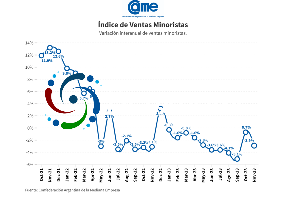 Así surge del Índice de Ventas Minoristas Pymes de la Confederación Argentina de la en Mediana Empresa (CAME), elaborado en base a un relevamiento mensual entre 1.320 comercios minoristas del país, realizado del 30 de noviembre y el 1 de diciembre.