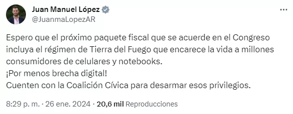 Ahora fue después de sacar el paquete fiscal del megadecretazo de Milei y pidiendo en redes sociales que en el próximo paquete se acuerde en el congreso incluir al regimen de Tierra del Fuego que encarece la vida a millones de consumidores de celulares y notebook.
